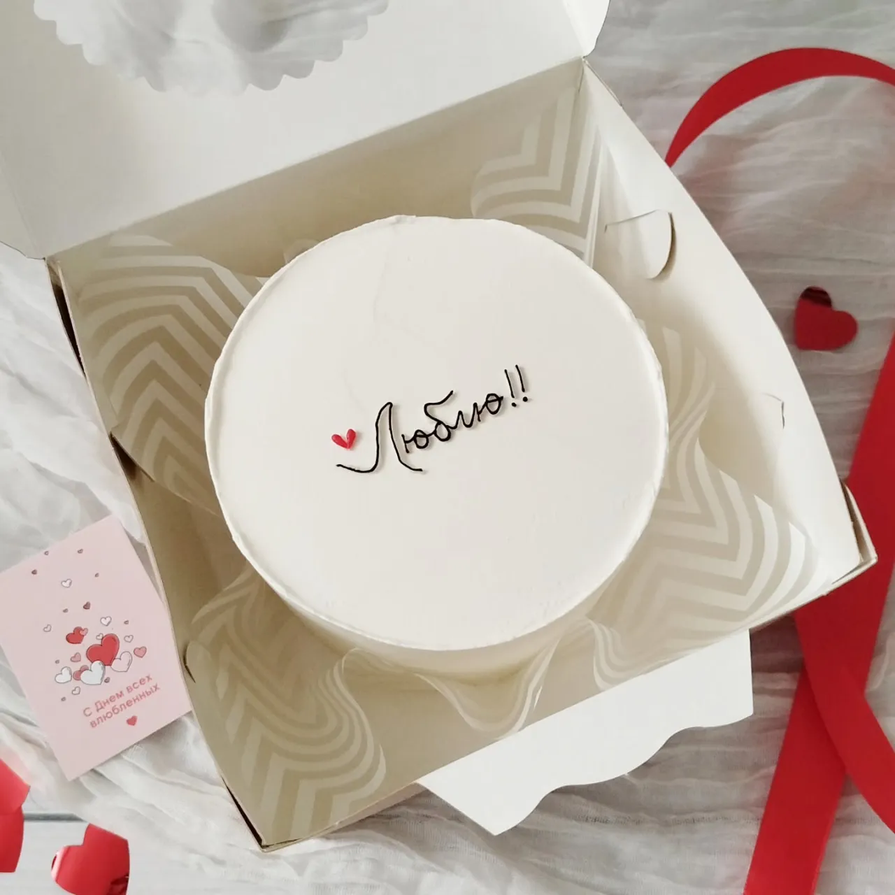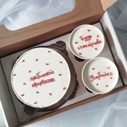 Бисквитный бенто‑торт в минималистичном стиле с надписью «Люблю» — идеальный формат для признания в любви, Дня святого Валентина или небольшого семейного праздника. Вес торта около 750 г.