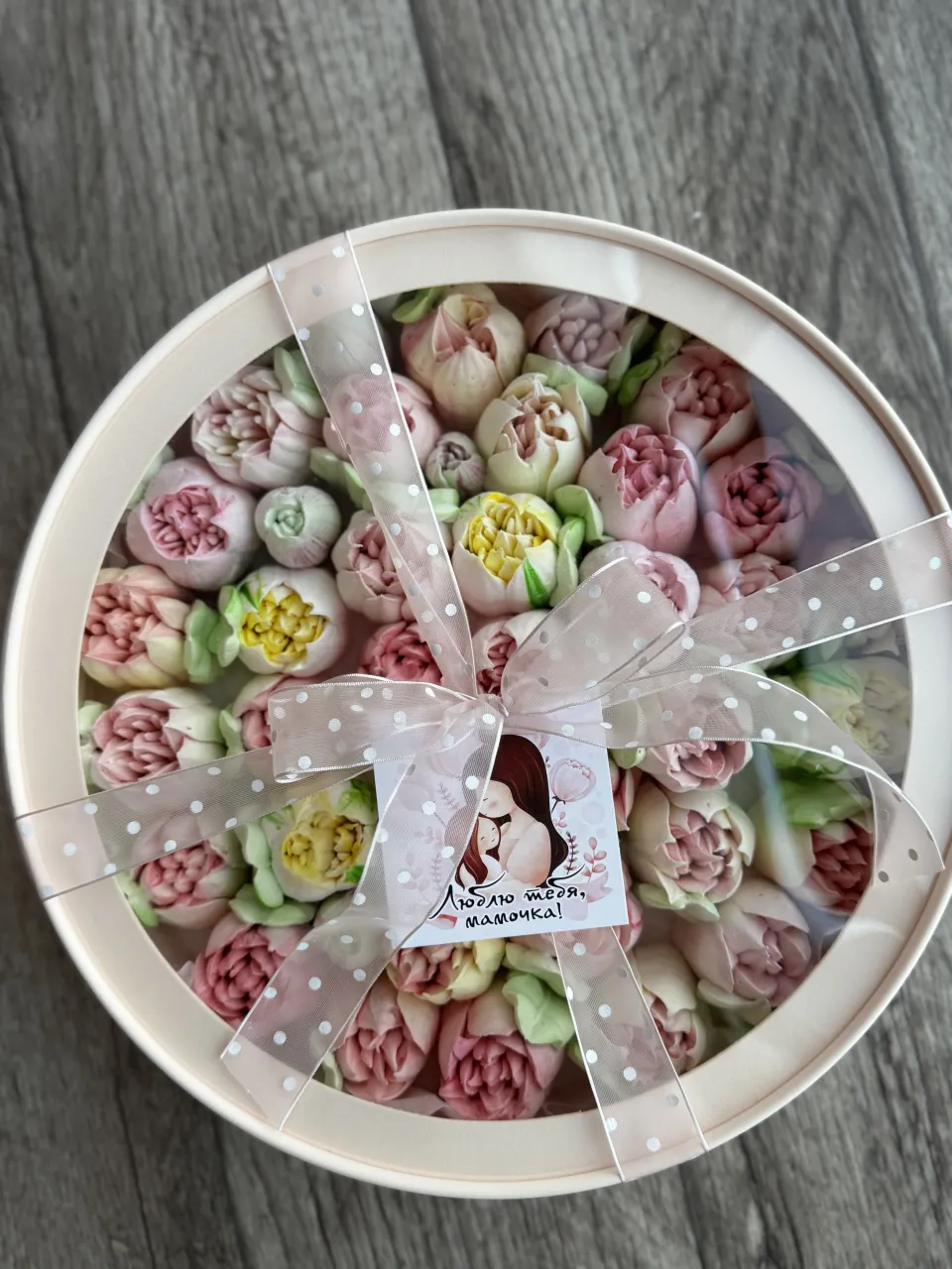 Круглая коробка д30 зефирных тюльпанов