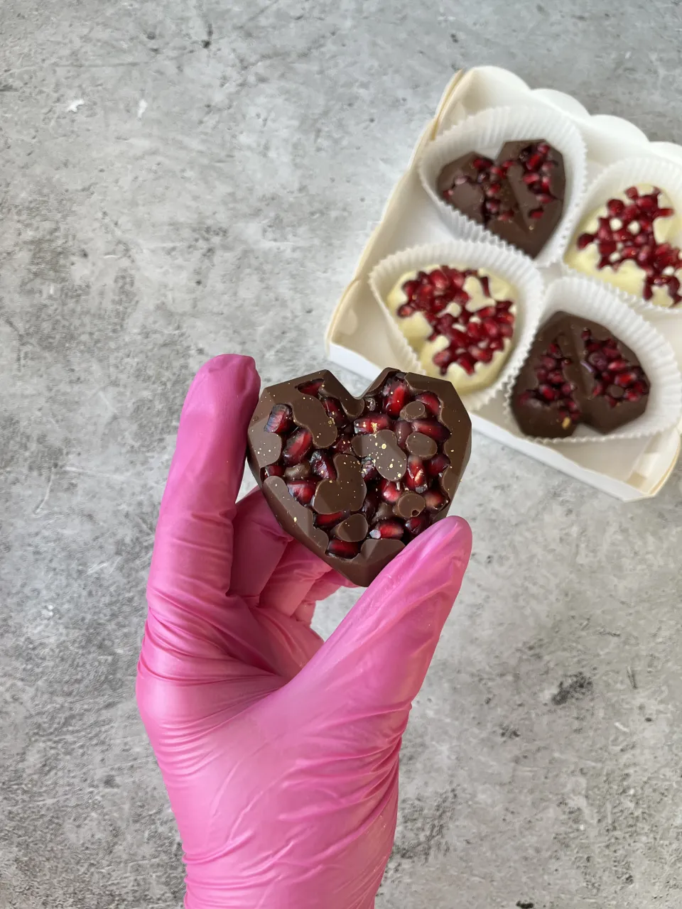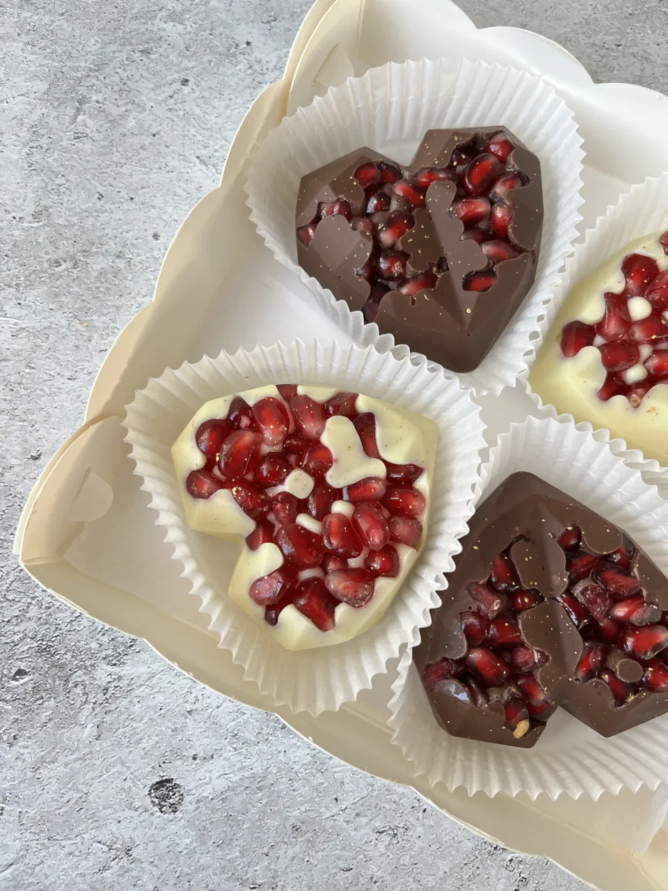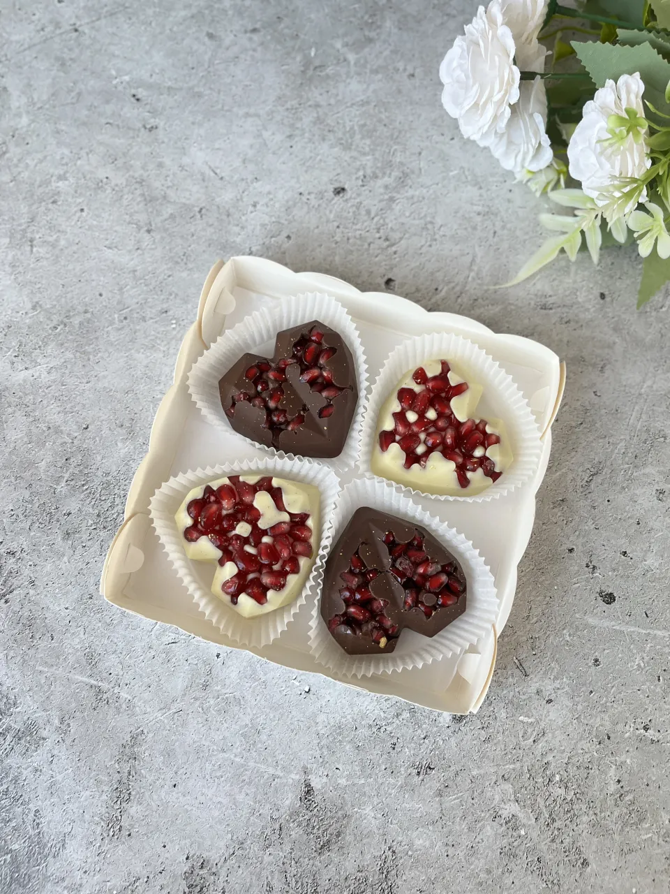 В наборе 4 сердечка из белого и молочного шоколада со свежим гранатом