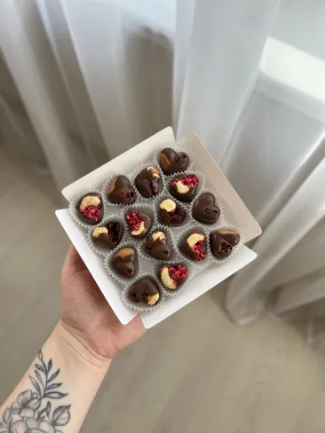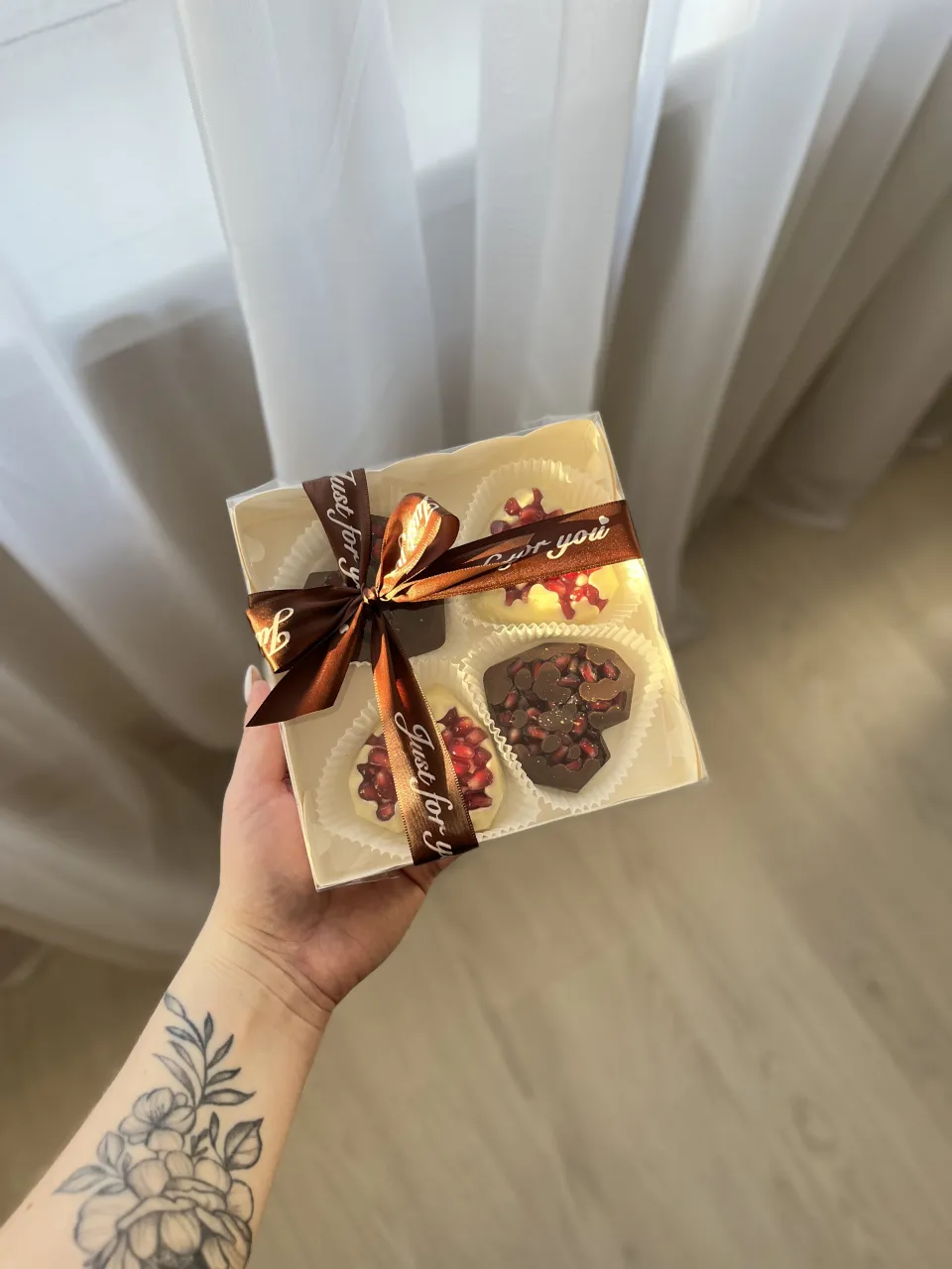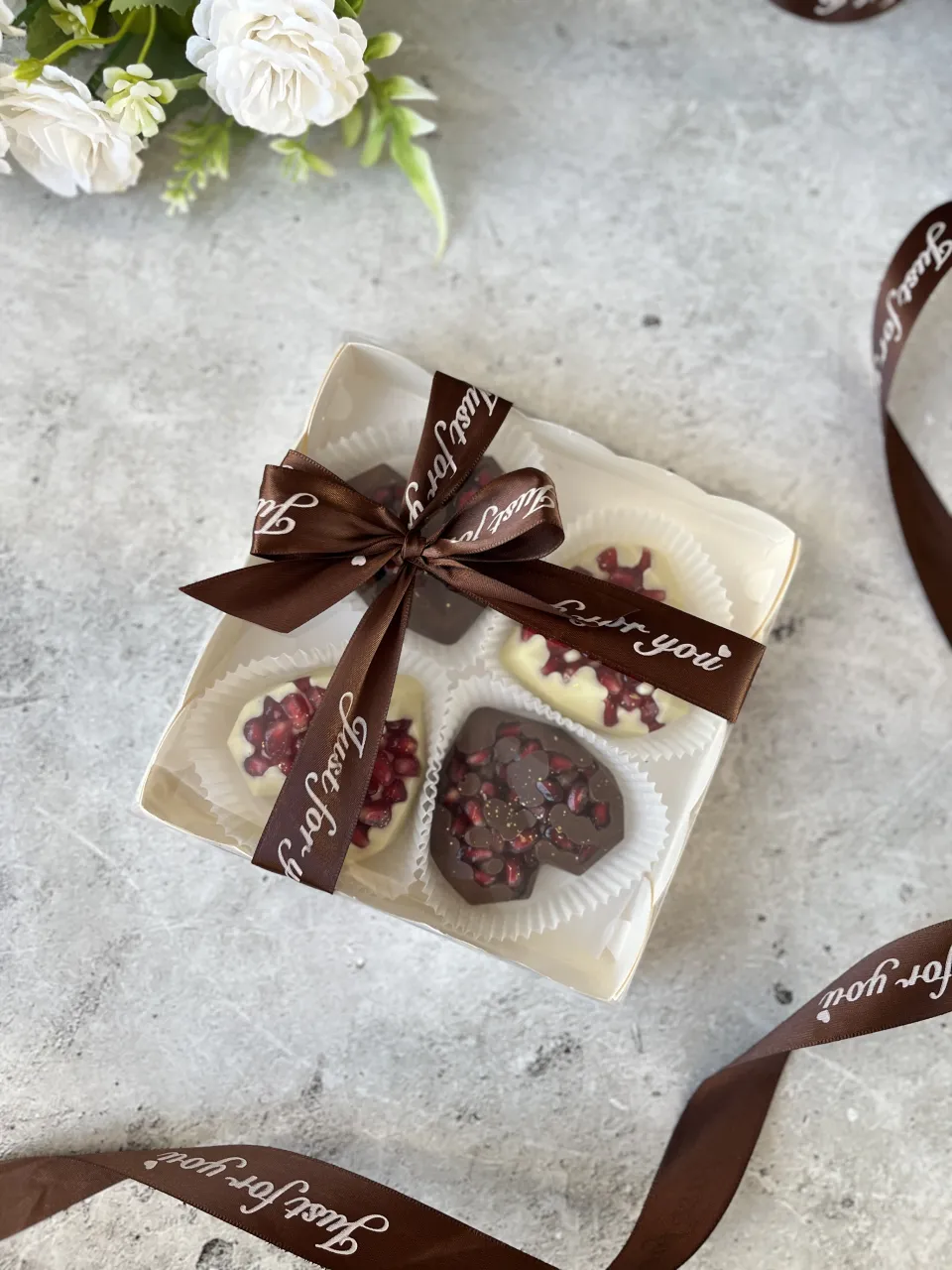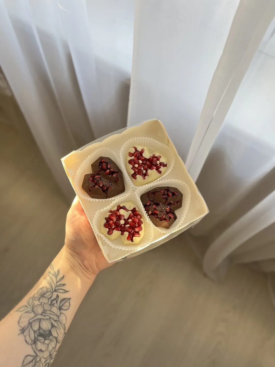 В наборе 4 сердечка из белого и молочного шоколада со свежим гранатом