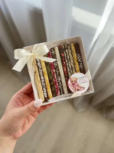 Состав: шоколад молочный (сахар, какао-масло, молоко сухое цельное, молоко сухое обезжиренное, какао тертое, эмульгатор лецитин, экстракт ванили), шоколад белый (сахар, какао-масло, молоко сухое обезжиренное, молоко сухое цельное, эмульгатор лецитин, экстракт ванили), гранат.