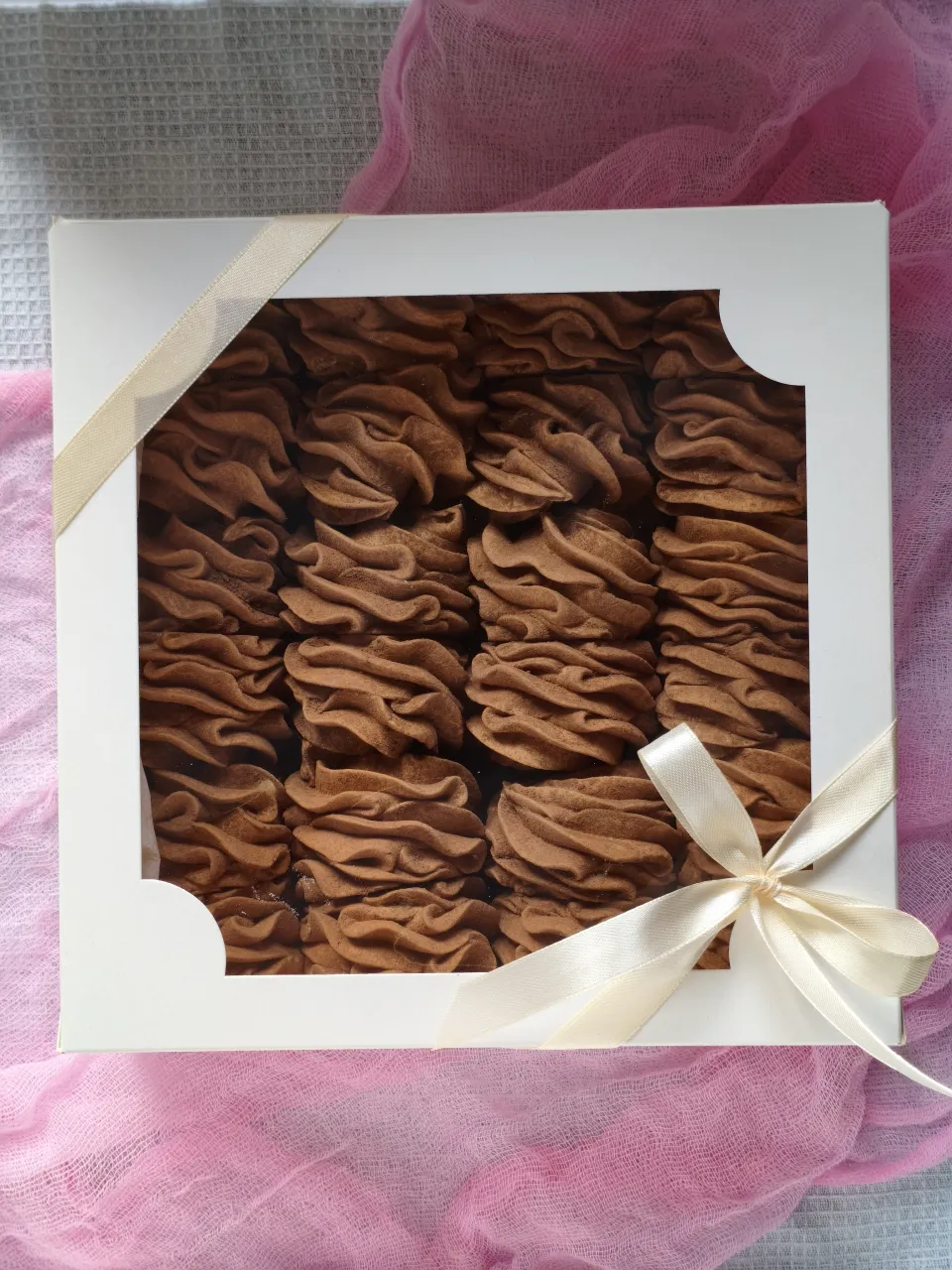 Коробка 20×20, перевязывается лентой, открытка из наличия.
