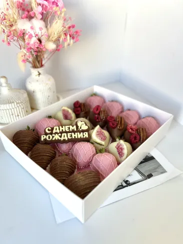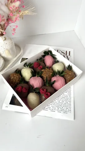 Набор клубники в шоколаде упакован в праздничную упаковку с лентой, а также в бумажный пакет. Клубника в шоколаде изготавливается непосредственно перед отдачей. Срок хранения - 24 часа в холодильнике.