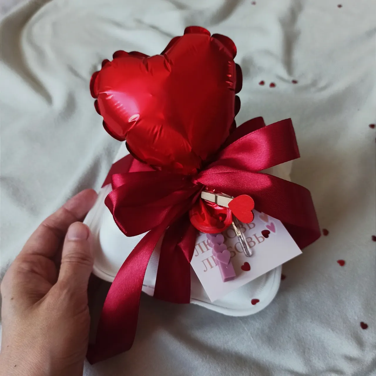 Все коробочки перевязаны атласной лентой с шариком-сердечком, в комплекте свеча и ложечка, выдаётся в пакете.